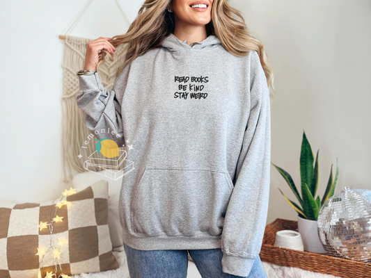 Read Books. Be Kind. Stay Weird. Embroidered Cozy Bookish Hoodie - White Embroidery