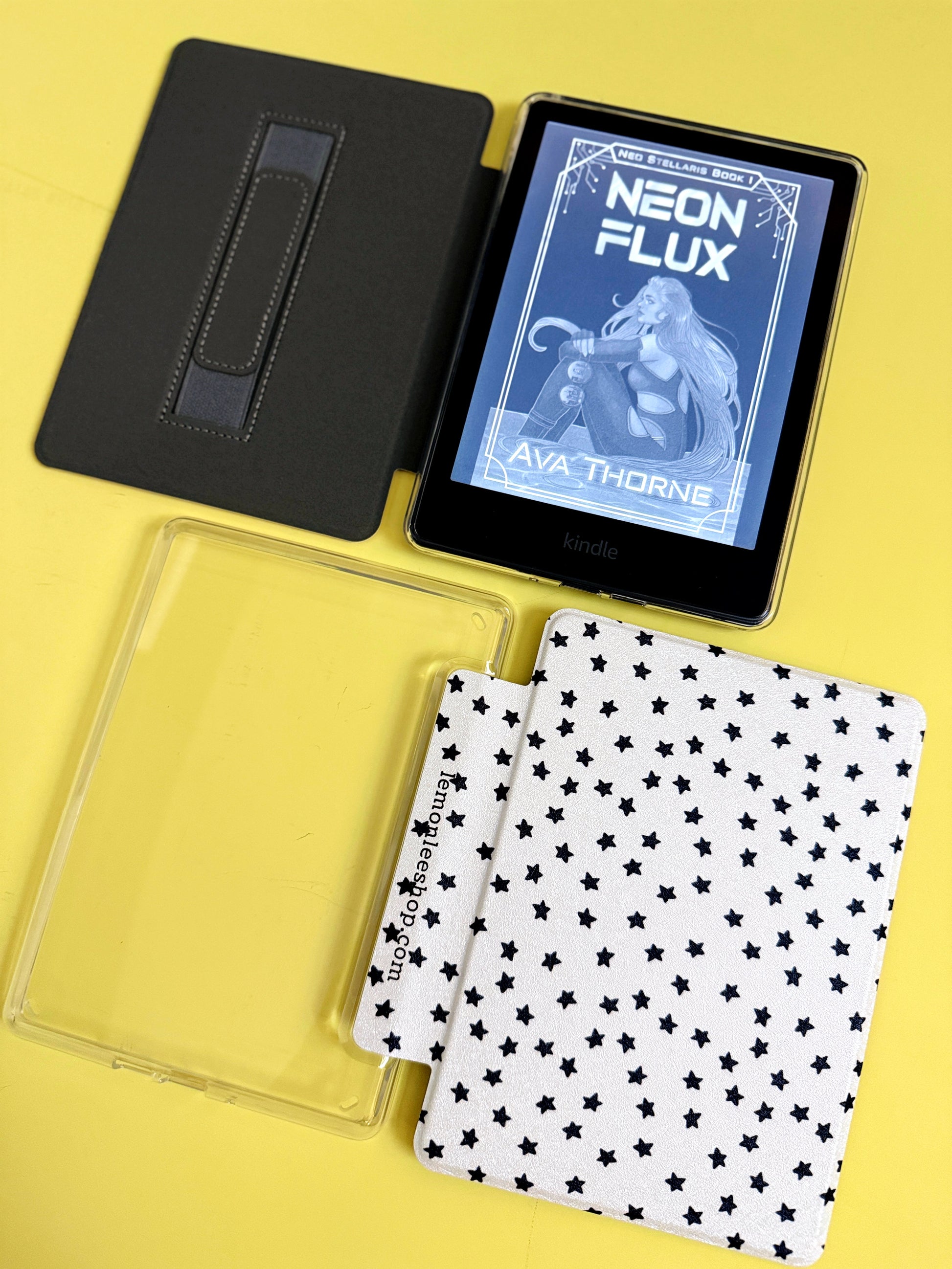 Introducing the Best of Both Kindle Cases - still have fun decorating the clear back of your case with bookish stickers but protect your beloved Kindle with a flip cover case with a built in strap!! These custom cases feature a full designed cover front, uniquely designed by LemonLee!